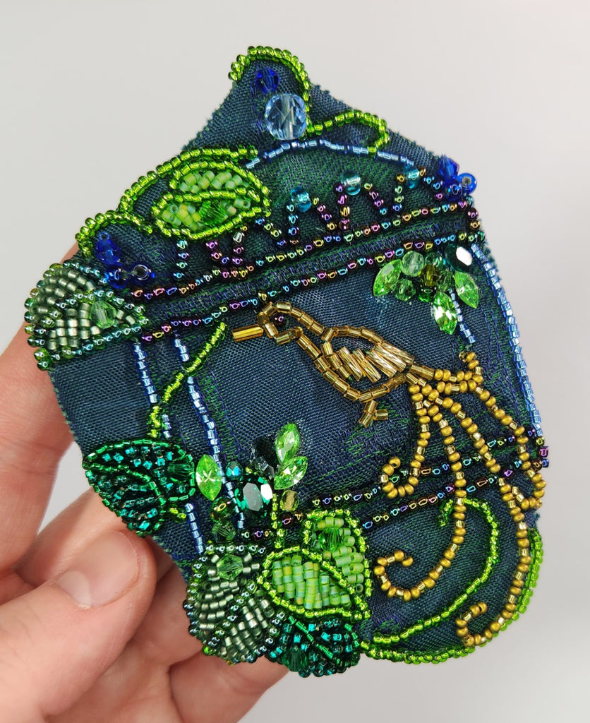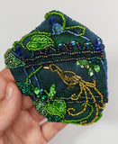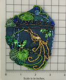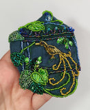 Handmade beaded velvet badge featuring an intricate bird motif with rich green, blue, and gold beadwork, crystal accents, and layered embroidery on deep blue fabric. Backed with soft velvet for a luxe finish. Perfect as a statement patch for coats, bags, costumes, or display.