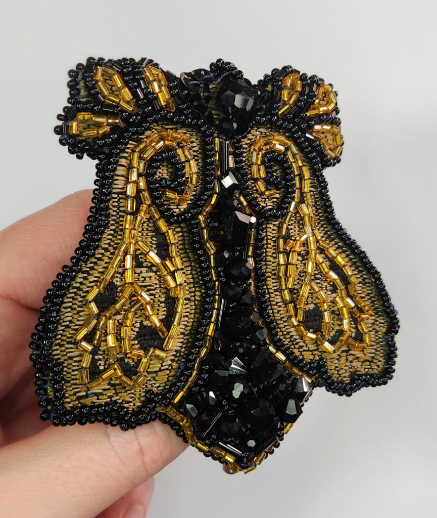 A dramatic handmade beaded brooch featuring black and gold embroidery, swirling beadwork, and faceted black crystals for rich texture and depth. Bold yet refined, it’s a striking accent for hats, coats, or statement styling.