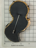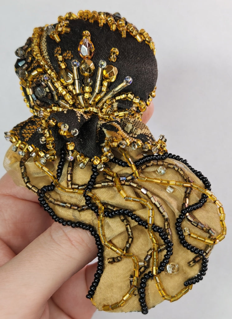 This one-of-a-kind jellyfish brooch is intricately hand-beaded in rich antique gold, black, and champagne tones, with glass beads and crystals for depth and sparkle. A striking statement piece inspired by the ocean.