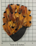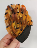 A bold handmade feather hat pin showcasing rich golden-brown and black spotted feathers, finished with a genuine black leather trim. Eye-catching and lightweight, it’s perfect for adding texture and drama to hats, coats, or costume looks.