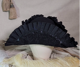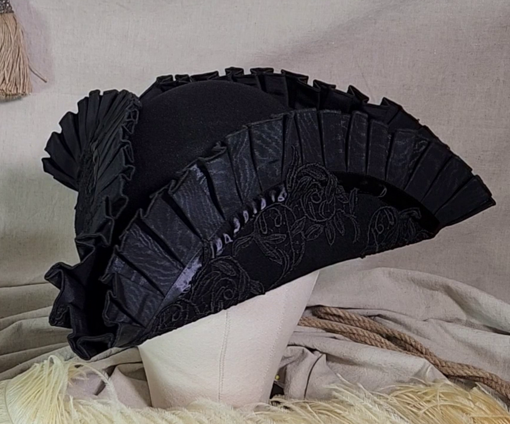Built on a synthetic felt black base, the frill is hand-pleated black moiré taffeta, with hand-cut lace carefully free-motion and hand sewn, and black satin border.