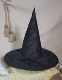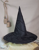 This stunning full sized witch hat is a hand-made from black textured weave fabric with black lace masks, cord, and ribbon embroidered on, with gold threadwork reflecting the pattern underneath.  The cone and brim structure are cut from our 3mm EVA foam, sandwiched between the fabrics.