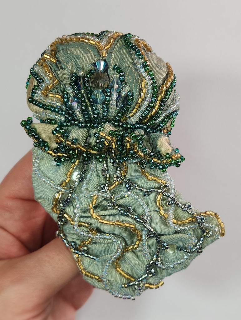 This unique jellyfish brooch is intricately hand-beaded in ocean tones of teals, greys, and sun-kissed gold on brocade fabric, with glass beads and crystals for depth and sparkle. A striking statement piece inspired by the ocean.