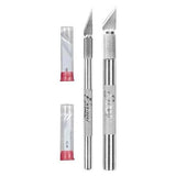 Set includes knife handles that house a 4-jaw aluminum chuck for more secure blade positioning and hold than your standard light duty knife. Also includes a snug fitting, twist lock shatter-resistant safety cap to protect the blade while stored.