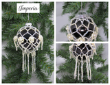 White and shimmering clear glass seed beads, paired with elegant faux pearls, beautifully surround a sophisticated black glass ball. The 3-inch diameter ball is enhanced by the graceful beadwork, making this ornament a stunning addition to your holiday decor. With a total length of 5.5 inches from the top of the ball to the lowest hanging point, it offers an elegant and refined presence on your tree or display. Handcrafted with care, this ornament is sure to become a timeless part of your festive traditions.