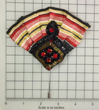 Handmade beaded fan hat pin featuring bold red crystals, black and antique gold beadwork, and a striped fabric fan in red, gold, and black. Finished on a secure hat pin backing. Dramatic, lightweight, and perfect for pirate hats, witch hats, coats, or gothic costume styling.