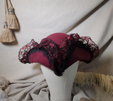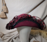 Set sail in style with this finely crafted handmade pirate hat, designed for the bold adventurer at heart. Expertly crafted with double black lace details on a burgundy base, this hat is perfect for those who want to add a touch of swashbuckling flair to their wardrobe, or turn heads at the renaissance fair.