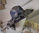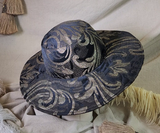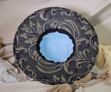 Built on a synthetic felt pale blue base, the cream and black brocade is carefully fitted and sewn all around. The fabric is then quilted through all the layers for a beautiful dimensional detail.