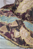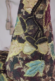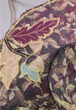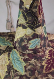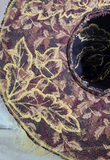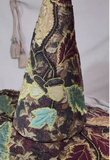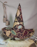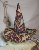This stunning full sized witch hat is a collage of tapestry fabrics, richly appliqued with gold thread around inlaid oak leaves and acorns. The cone and brim structure are cut from our 3mm EVA foam, with the fabrics sewn on either side.