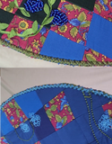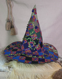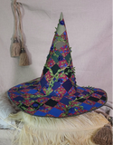 This stunning full sized witch hat is a hand-made quilt from scratch, richly detailed with hand-beaded berries, delicate vines, and an embroidered edge. The cone and brim structure are cut from our 3mm EVA foam, sandwiched between the fabrics.