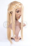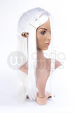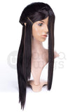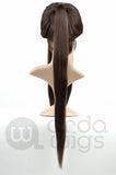 This wig's ponytail is attached and is not a clip-on ponytail like the Jeannie. It sports a small 1" (2.5 cm) fringe at the base of the neck to cover your hair. Jasmine has a 2" (5 cm) skin cap where the bangs meet the head, 23" (58.5 cm) long bangs and a length of 27" (68.5 cm) from the base of the ponytail to the end.