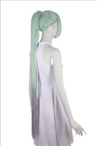 You'll have all the rhythm you need with this ponytail. Rhythm is specially made with a detachable extra long pony and small neck fringe to help hide any errant neck hairs. A removable ponytail helps with wig heaviness while still allowing for reponytailing, resizing, and restyling. The ponytail is dip-dyed a light green to purple and a small bang is present at the front hairline. Now, show us what you got!