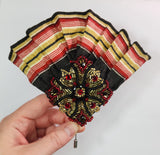 A bold, richly beaded handmade brooch pin with deep garnet crystals, black, and antique gold beads. A truly commanding piece for a gothic or vampire-inspired flare. Finished on a hat pin backing with a faux suede back, it’s perfect for hats, coats, or statement styling.