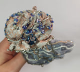 This one-of-a-kind jellyfish brooch is intricately hand-beaded in rich pale pinks, greys, and blues, with glass beads and crystals for depth and sparkle. A striking statement piece inspired by the ocean.