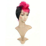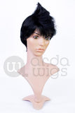 Rufio is short on the sides and approximately 2-4" (5-10 cm) long on the top. This specialty wig is styled into a faux-hawk with lots of pre-teased fibers and no skin top. This wig is relatively thick, but be careful in the back - if you spike it too straight with hairspray, it may show some wefting underneath. The fibers on this style are made to be a bit curled at the tips.
