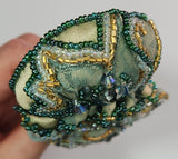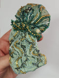 This unique jellyfish brooch is intricately hand-beaded in ocean tones of teals, greys, and sun-kissed gold on brocade fabric, with glass beads and crystals for depth and sparkle. A striking statement piece inspired by the ocean.